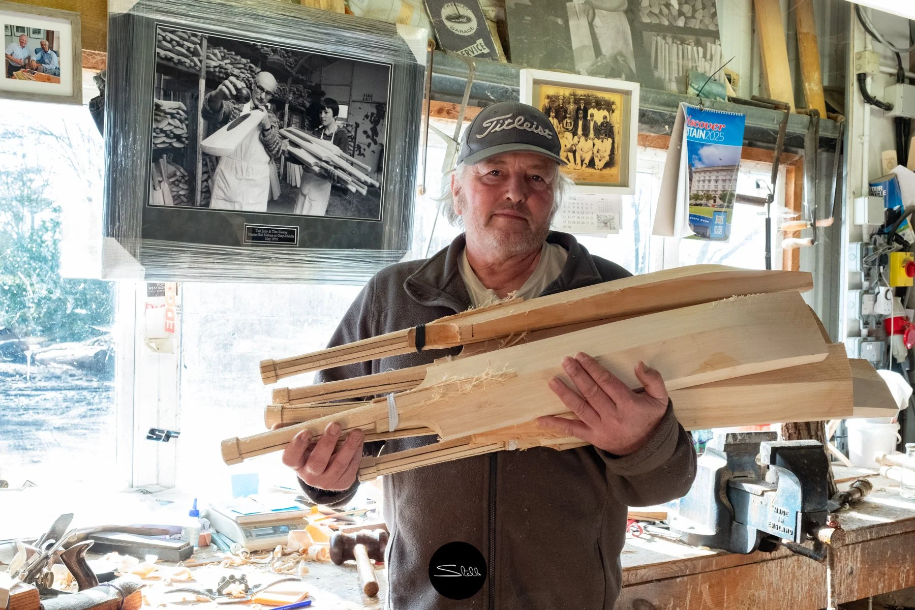 Tim Keeley with younger brother Fred Keeley (right) who manages the saw mill and Tim’s son Heston (left) an apprentice bat maker. He assists with buffing, sanding, and preparing clefts, while also learning the art of bat shaping and finishing..